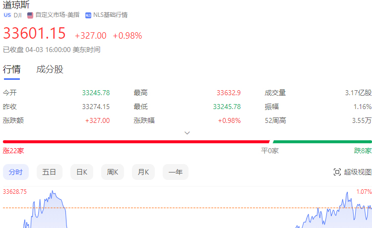从道琼斯工业平均指数来看,今天的表现相对较为强劲。其涨幅接近1%,收盘价也达到了较高的33601.15点。这一涨幅主要得益于银行、石油和石化等板块的强劲表现。而纳斯达克综合指数则出现了小幅下跌的情况。尽管科技股票仍然表现较为强劲,但是其他板块的表现不佳,令其整体走势受到拖累。